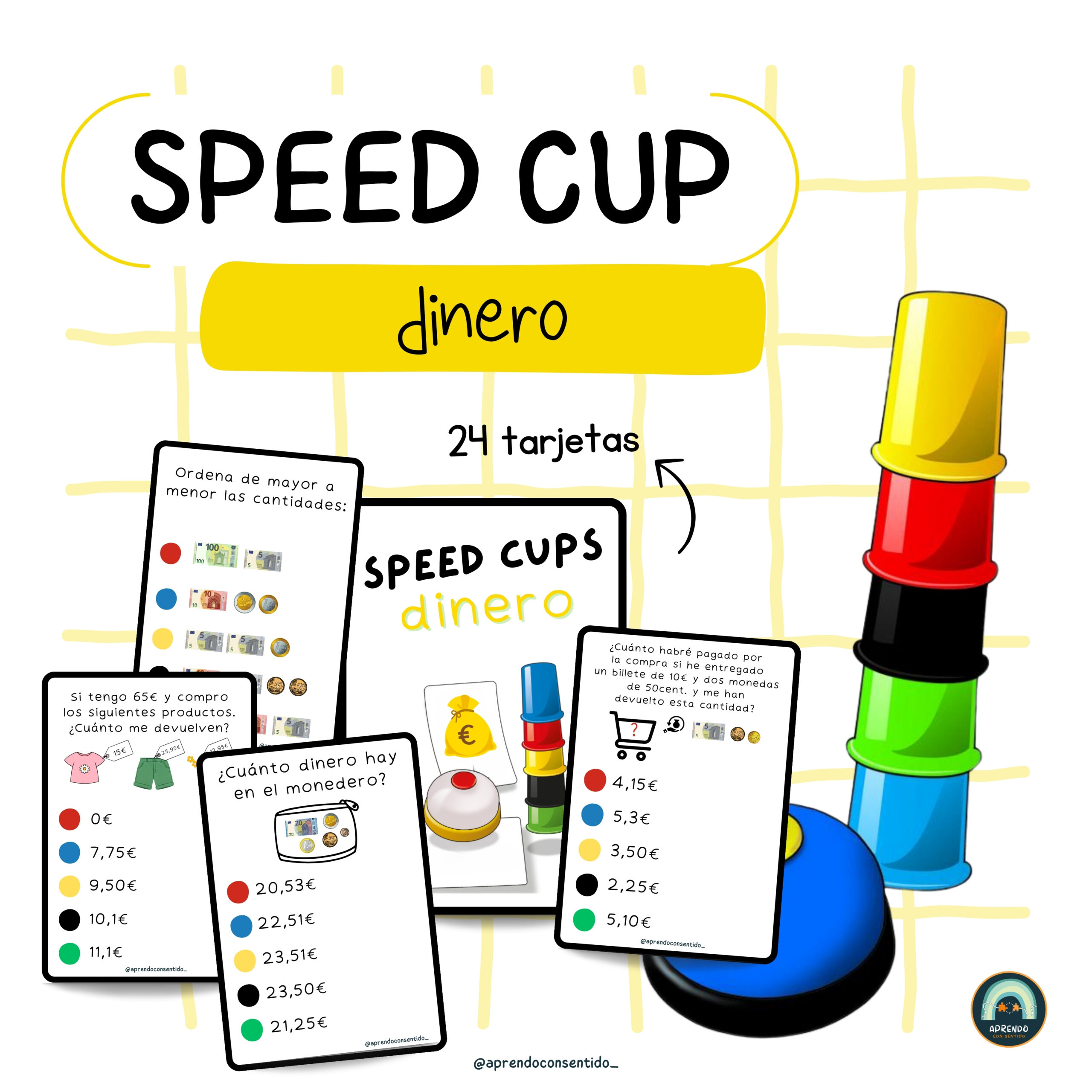 Este recurso consiste en la adaptación del juego Speed Cups, en concreto, incluye tarjetas para trabajar el manejo del dinero.
