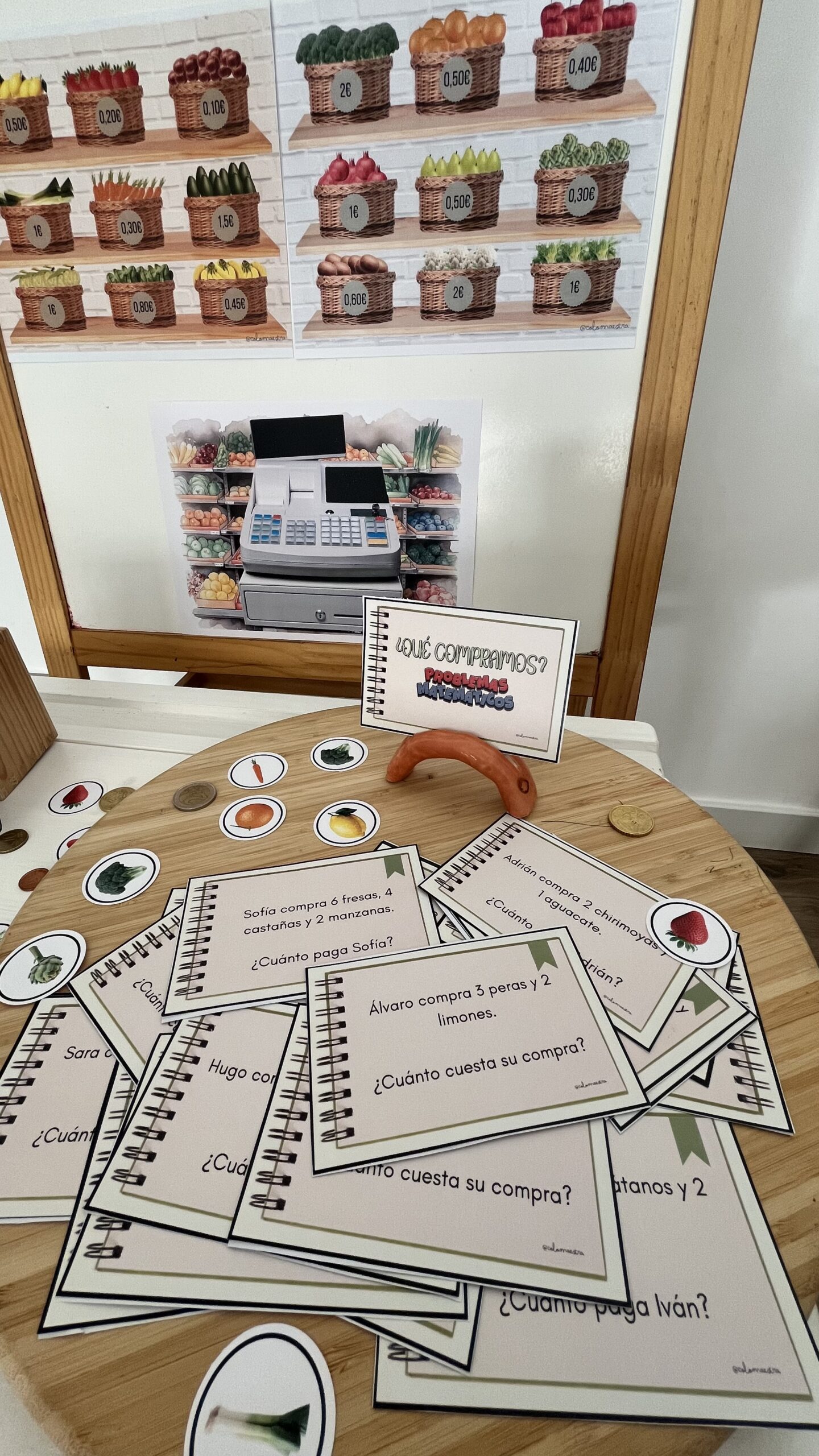 Un material imprimible para crear en tu aula un rincón del mercado. Contiene monedas imprimibles, atrezo, diferentes frutas y verduras (temporada invierno) y un pack de problemas con su solucionario.
